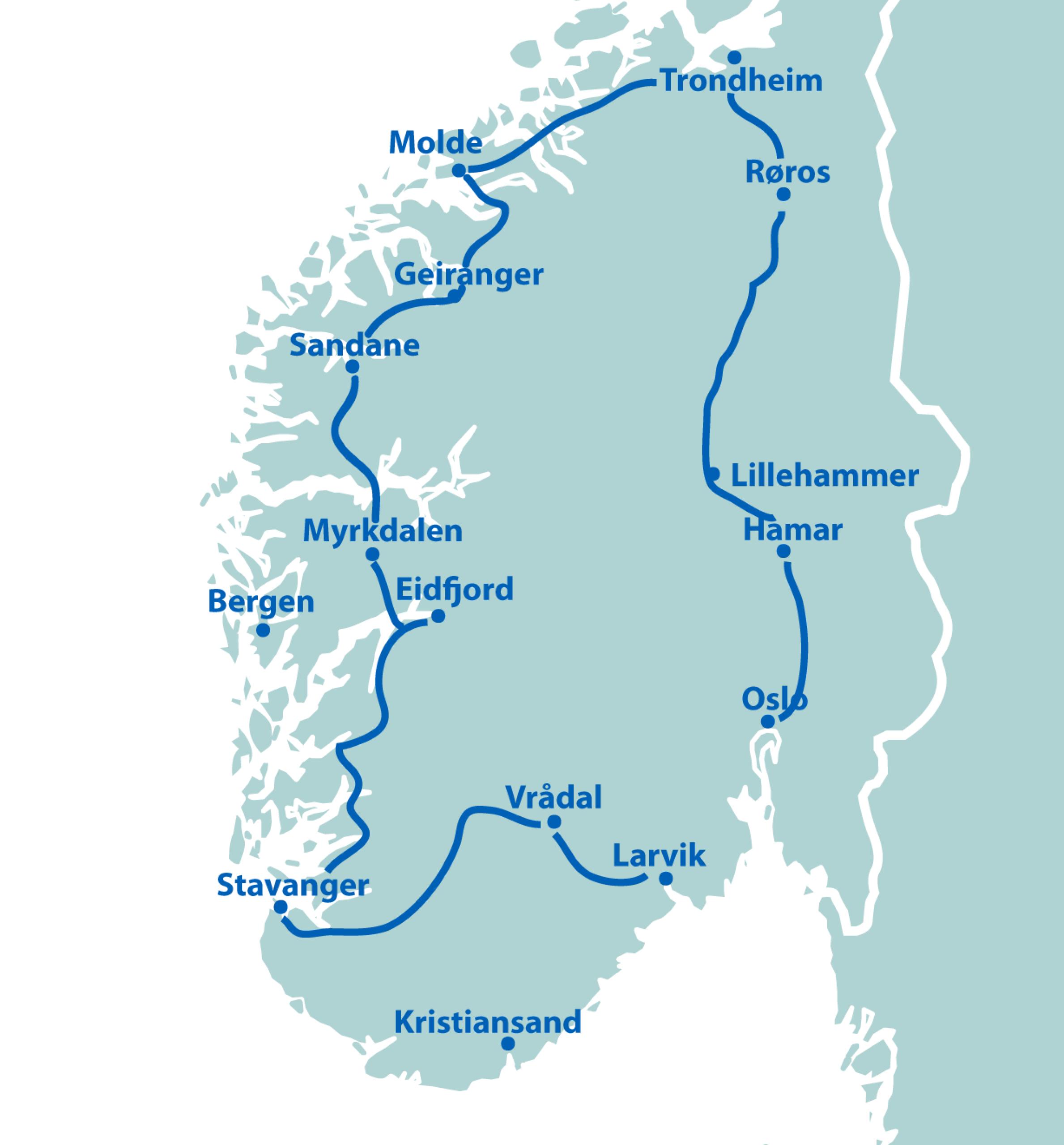 Sie fahren durch Gebirgsnorwegen weiter gen Süden. Die Fahrt ist geprägt von langen Flusstälern, weitern Wäldern und im Flachland von intensiv landwirtschaftlich genutzten Flächen. Ihr Tagesziel ist Hamar am großen Mjøsasee. Das Wahrzeichen der Stadt ist das umgedrehte Wikingerschiff, das eine der schnellsten Eislaufhallen der Welt beherbergt und 1994 Austragungsort der Olympischen Winterspiele war. Auch die moderne Glaskonstruktion Hamardom über den alten Domkirchen-Ruinen ist sehenswert.